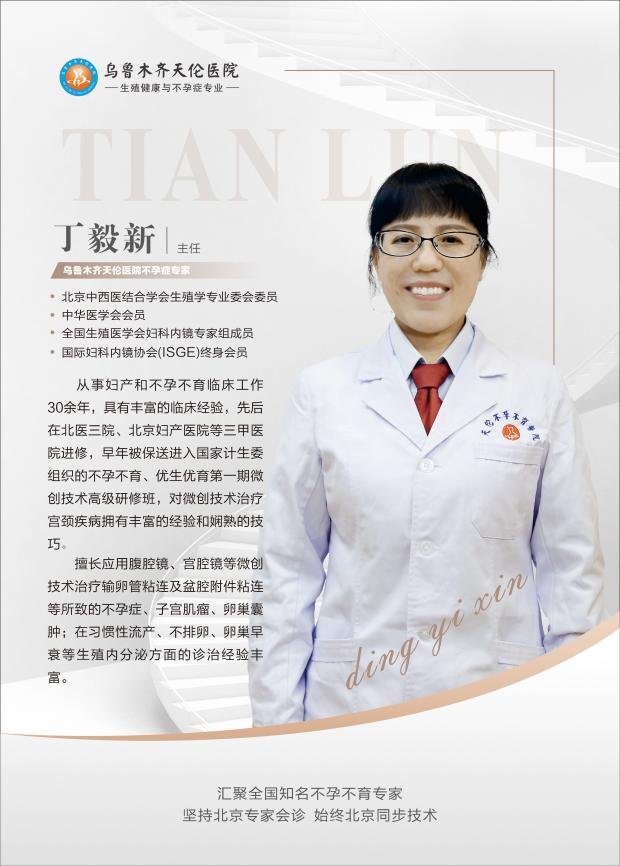 丁毅新 【北京中西医结合学会生殖学专业委会委员】天伦医院不孕症专家从事妇产和不孕不育临床工作三十余年,具有丰富的临床经验,先后在北医三院、北京妇产医院等三甲医院进修,早年被保送进入国家计生委组织的不孕不育、优生优育第一期微创技术高级研修班,对微创技术治疗宫颈疾病拥有丰富的经验和娴熟的技巧;擅长应用腹腔镜、宫腔镜等微创技术治疗输卵管粘连及盆腔附件粘连等所致的不孕症、子宫肌瘤、卵巢囊肿;在习惯性流产、不排卵、卵巢早衰等生殖内分泌方面的诊治经验丰富。曾入选卫生系统人才计划Ⅰ类培养对象。
